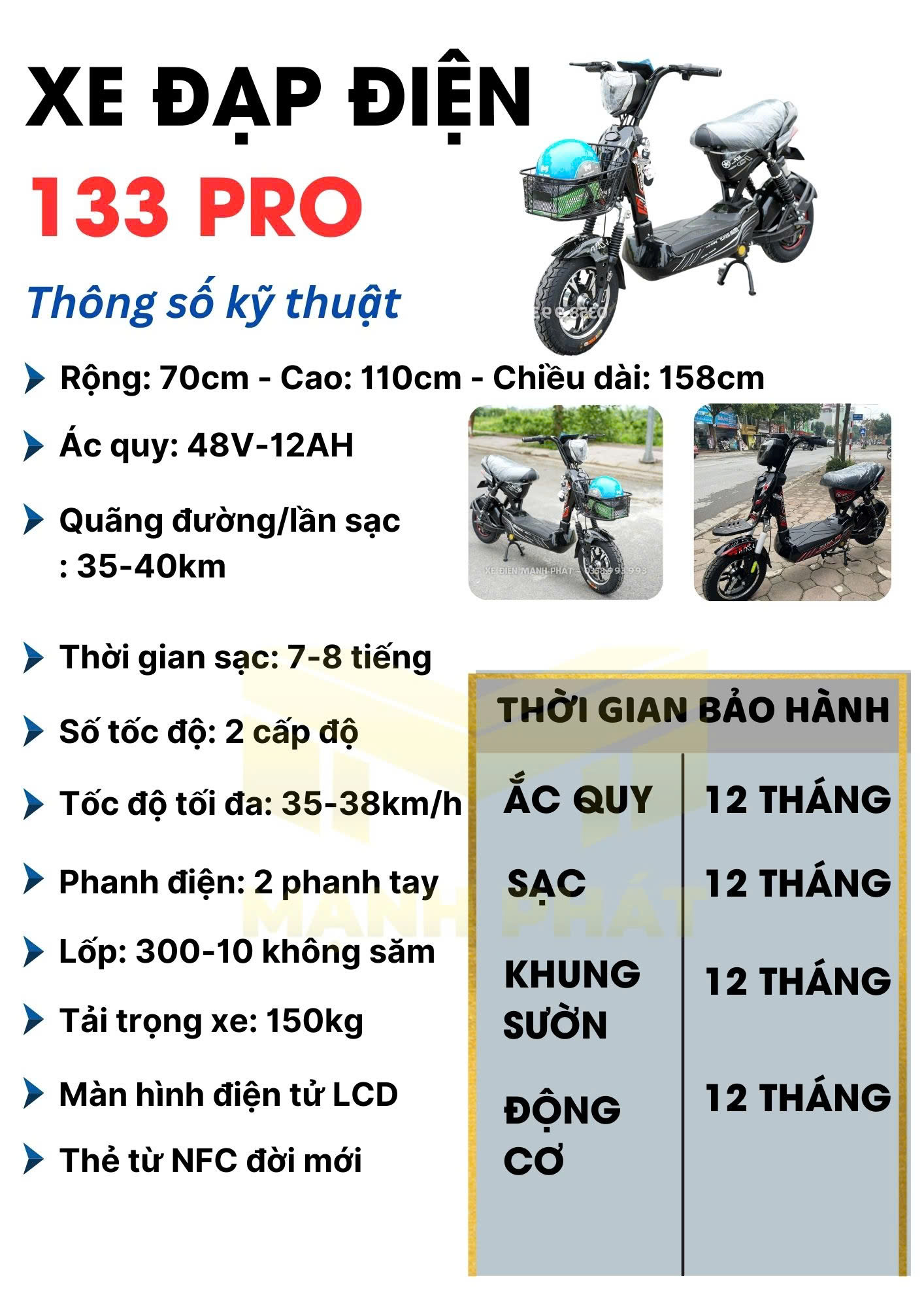 Xe đạp điện 133 PRO hiện đang được phân phối chính hãng tại hệ thống của Xe Điện Mạnh Phát. Với thời gian bảo hành động cơ lên đến 1 năm, cùng chế độ bảo dưỡng khách hàng có thể hoàn toàn yên tâm về chất lượng và dịch vụ. Bạn có thể đến bất kỳ chi nhánh nào của Xe Điện Mạnh Phát để trải nghiệm và lựa chọn sản phẩm phù hợp với nhu cầu của mình.