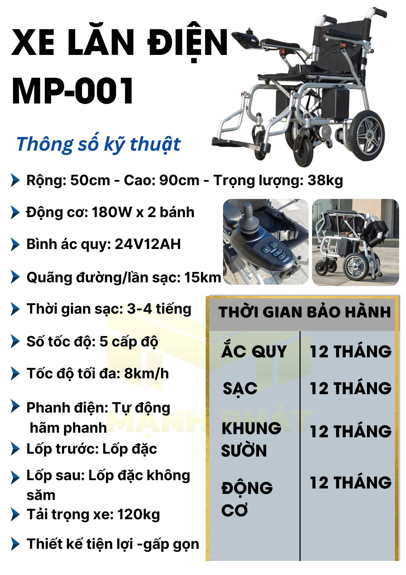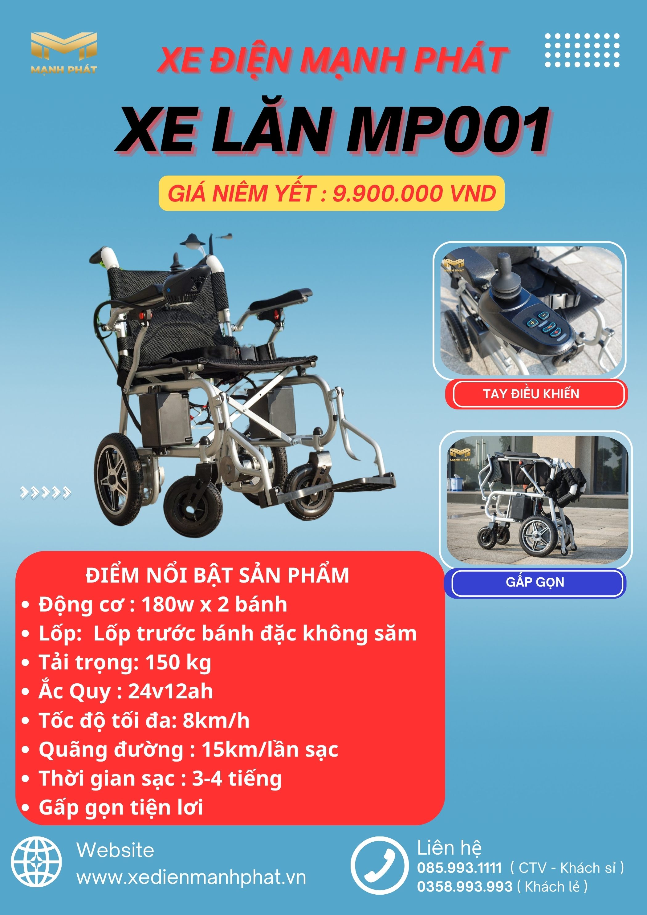 Xe lăn điện MP001 là một dòng xe lăn điện giá rẻ, được thiết kế để đáp ứng nhu cầu của nhiều đối tượng người dùng khác nhau. Khung xe được làm từ hợp sắt tĩnh điện, mang lại độ bền cao và khả năng chống ăn mòn, đảm bảo xe có thể sử dụng lâu dài trong mọi điều kiện thời tiết.